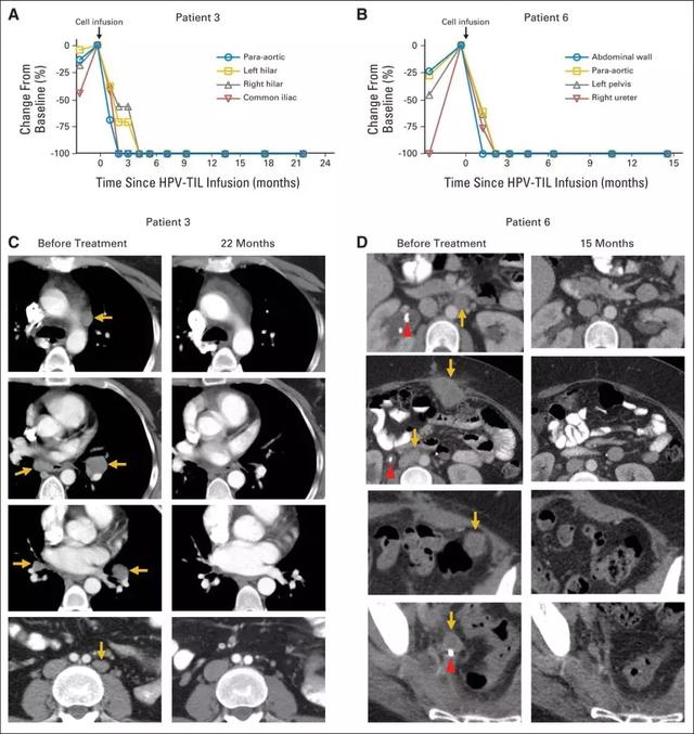 另一患者患有转移性腺癌。她的 原发性肿瘤对化放疗无效。随后转移到更多的腹膜后淋巴结和肝脏表面,在TIL治疗前,她在腹膜后,腹壁,旁系,肝旁和盆腔部位有肿瘤进展(图1B和1d)。在治疗后,出现完全的临床缓解(图1B和1d)。