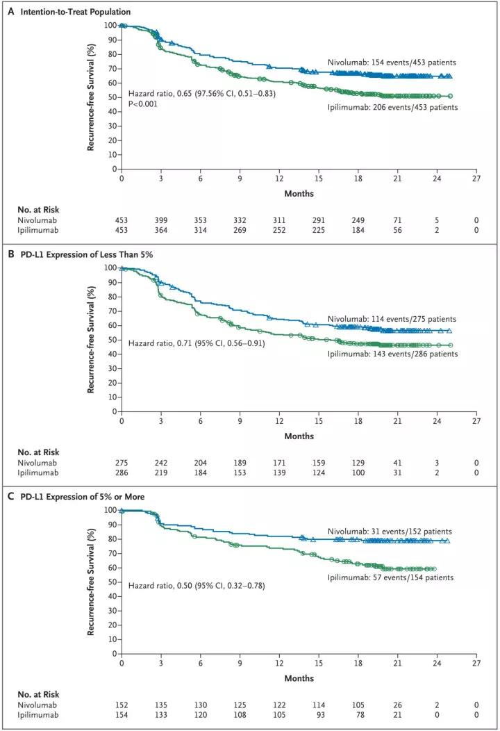图1. Nivolumab组合Ipilimumab组患者的无复发生存率分析。A图显示两组意向治疗患者,即总体的无复发生存率,显然Nivolumab组的无复发生存率要高于Ipilimumab组;B图显示两组PD-L1表达低于5%的患者无复发生存率,其中Nivolumab组在第12个月为64.3%,Ipilimumab组对应为53.7%;C图显示两组PD-L1表达超过5%的患者无复发生存率,其中Nivolumab组在第12个月为81.9%,Ipilimumab组对应为73.8%。