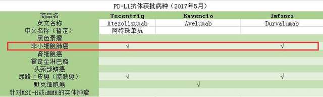 相比与PD-1抗体只有纳武单抗(Opdivo)和派姆单抗(Keytruda),PD-L1的审批更加迅猛。一年时间内PD-L1抗体获批的药物已有三个:第一个是阿特珠单抗(Tecentriq),被批准用于尿路上皮癌(膀胱癌)和晚期非小细胞肺癌(NSCLC)、第二种是Durvalumab(Imfinzi),获批的适应症包括非小细胞肺癌和尿路上皮癌(膀胱癌)、第三种是Avelumab(Banencio)。