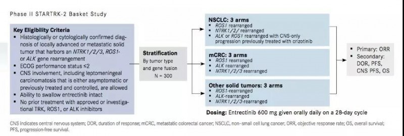 第二阶段多中心STARTRK-2篮式试验(NCT02568267)根据患者的肿瘤类型和基因融合对患者进行分层。在2项I期临床试验中,研究人员检测了entrectinib的安全性和有效性,并证实了在多种肿瘤类型中的强大活性。试验表明,该药物耐受性良好,一般不良事件(AE)可逆、可控。