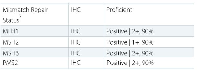 全球肿瘤医生网的另一例患者经美国凯瑞思基因检测()后,四个蛋白表达均为positive(阳性),也就是说该患者为pMMR,不适用于上述获批的免疫疗法。