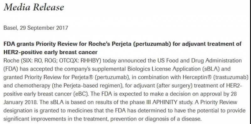 2017年9月,罗氏公司在官网宣布帕妥珠单抗加赫赛汀加化疗的三联疗法获得美国药监局的优先审批资格,作为HER2阳性、有高复发风险的早期乳腺癌患者的术后辅助疗法。