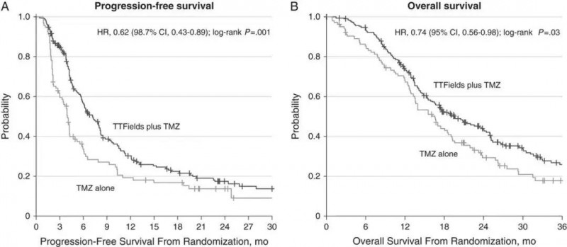 在国际EF-14试验中,695名完成放化疗的患者以2:1的比例随机接受电场疗法+替莫唑胺联合治疗或单独替莫唑胺(标准辅助治疗)的维持治疗。实验结果显示:TTFields组与对照组的中位PFS显着更长(7.1个月VS4.0个月)。联合组中位OS为20.5个月,而对照组为15.6个月。