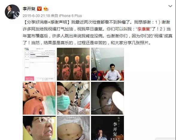 然而,在2015年6月30日,李开复发微博称,“最近两次检查都看不到肿瘤了”,自己已经完全康复,肿瘤消失。