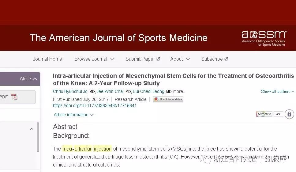2017年7月,《美国运动医学杂志》(《The American Journal of Sports Medicine》)刊发了一篇题为《关节内注射间充质干细胞治疗膝关节骨性关节炎:一项为期两年的随访研究》。结果表明:在2年时间内,关节腔注射自体脂肪间充质干细胞治疗膝关节炎安全、有效。