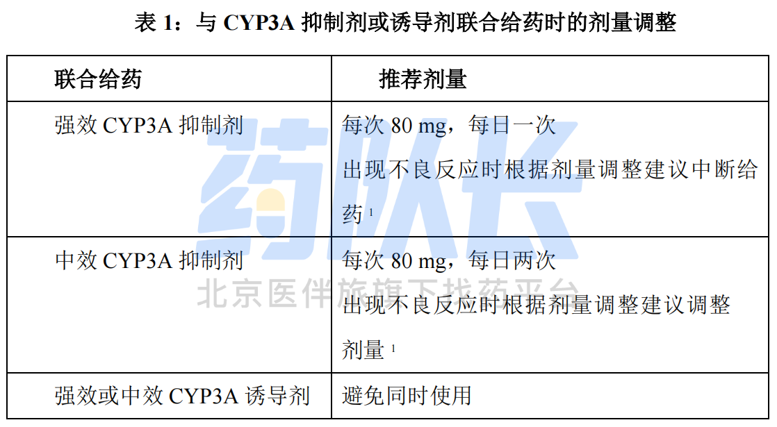 与 CYP3A 抑制剂或诱导剂联合给药时建议的剂量调整见表 1。