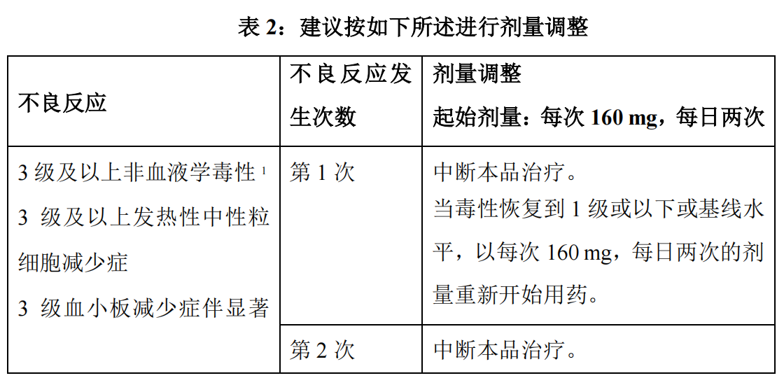 在治疗期间建议密切监测全血细胞计数,如发生血细胞减少,应根据临床需 求给予对症治疗;必要时暂停用药,待相关血液学不良反应缓解至用药条件后再恢复用药。