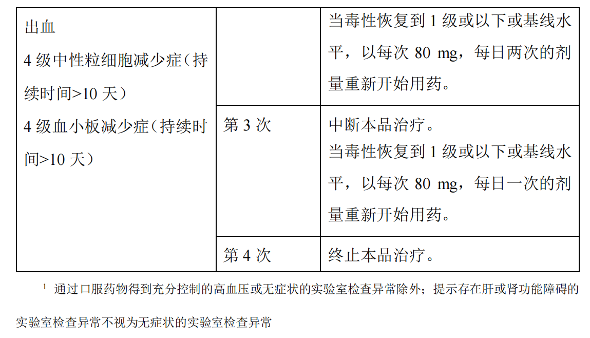 如发生与治疗有关的 3 级或 3 级以上的出血或任何级别的颅内出血时,应永 久终止本品治疗。