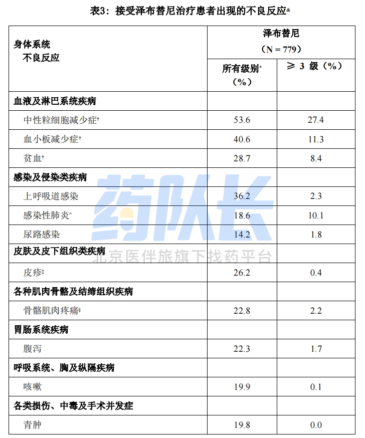 基于实验室检测结果,在接受本品单药治疗的血液系统恶性肿瘤患者中,血细胞减少十分常见,表现为中性粒细胞减少、血小板减少和贫血,并常见有 3 级 或 4 级血细胞减少症的报告。