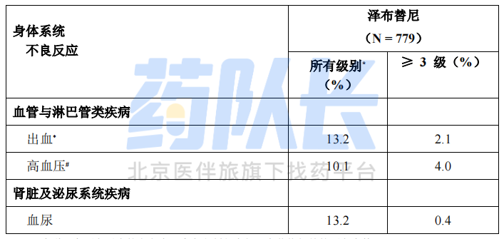 3.1%的患者发生严重出血事件,其中包括血尿和上消化道出血(各 0.4%)。