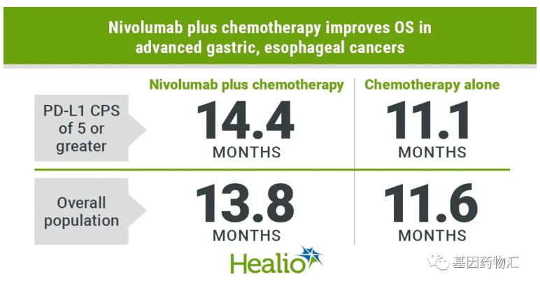 CheckMate-649试验中,纳武单抗一线治疗PD-L1表达阳性的患者,在总生存期方面具有一定的优势(13.8个月 vs 11.6个月),在PD-L1 CPS≥5的患者中优势更加显著(14.4个月 vs 11.1个月),目前已经获批。