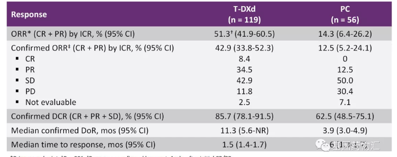 在缓解率方面,接受Enhertu治疗的患者整体缓解率为40.5%,显著高于接受化疗患者的11.3%;接受Enhertu治疗患者的中位无进展生存期为5.6个月,中位缓解持续时间11.3个月,同样显著超过了化疗患者的3.5个月和3.9个月。