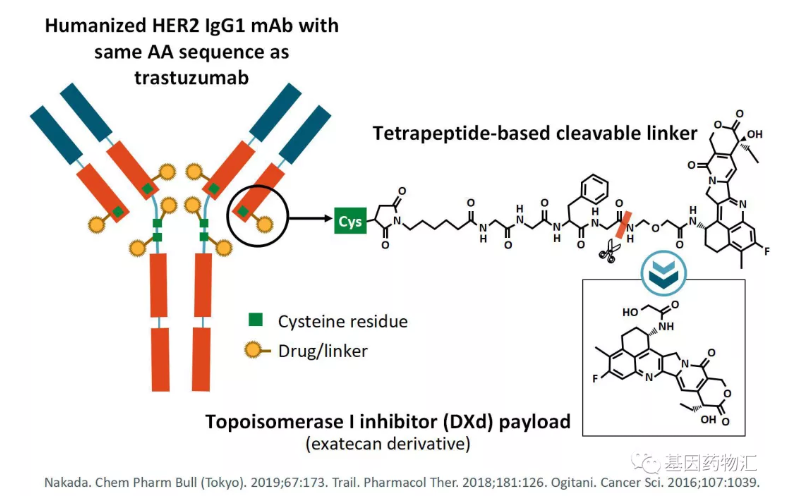德曲妥珠单抗由靶向HER2的人源化单克隆抗体通过四肽可裂解连接子与拓扑异构酶1抑制剂有效载荷连接组成。该药的作用机理为:首先通过药物中的抗体部分靶向并附着于癌细胞上的HER2;然后德曲妥珠单抗会进入癌细胞,释放化疗药物,ADC中的化疗部分可以杀死癌细胞以及附近的其它细胞。